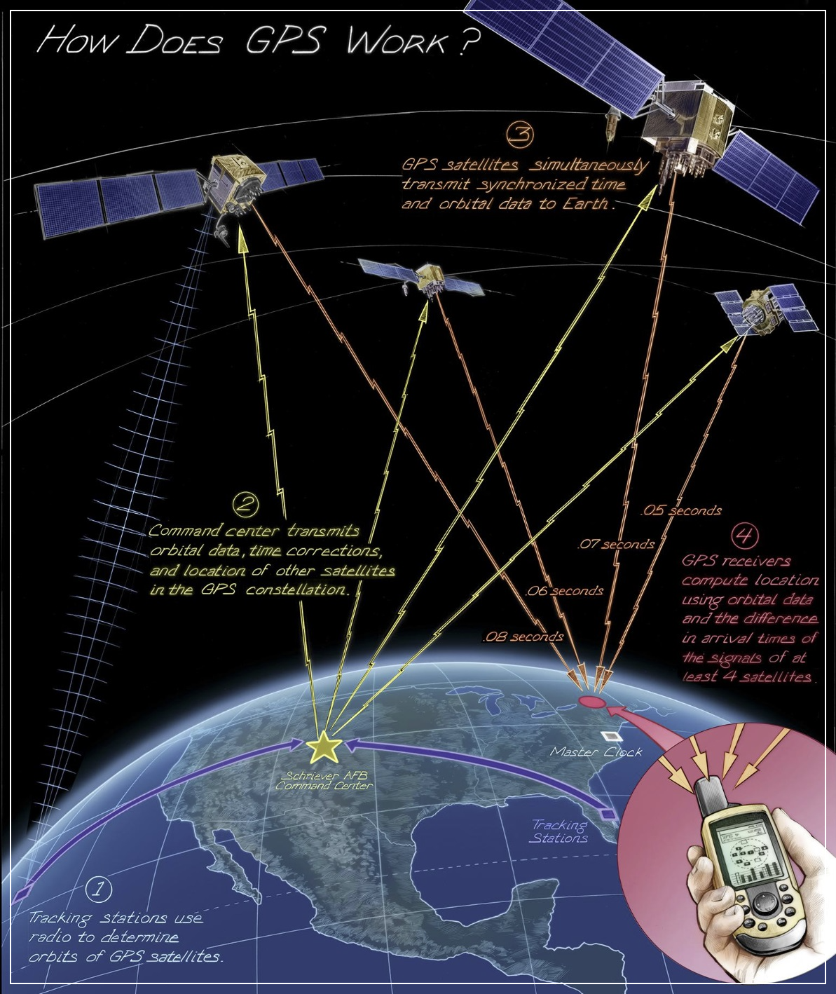 GPS는 최소 4개 이상의 위성에서 보내는 신호를 수신해 사용자의 정확한 위치를 계산하는 방식입니다. 주요 원리는 삼변측량(trilateration)입니다.